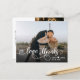Budget Modern Hand Lettered Wedding "Love and Thanks" Calligraphy Script Photo Thank You Cards. Modern Stylish wedding thank you card template featuring a full horizontal photo on the front with overlay text "Love and Thanks" in a swirly hand written typography script font with swashes in white on the picture. Add your custom names and thank you message. If you prefer to handwrite your note, just delete the sample text to make more space. Pretty, elegant low cost cheap cards. If You need help, please contact designer!