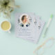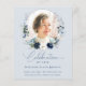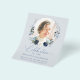 This is an elegant and modern funeral invitation card printed on a budget friendly flyer to celebrate the life of your loved one. The design features a beautiful calligraphy font and delicate floral wreath with blue, green and silvery botanicals that frame a photo. This invitation can easily be personalised with your own photo and text to create a special tribute for your loved one's funeral, memorial or celebration of life using the template provided.