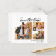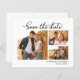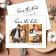 Budget Minimalist Elegant Calligraphy Script 3-Photo Collage Wedding Save The Date Cards in Black and White. This exquisitely delicate design is tailored precisely for contemporary weddings, exuding an enchanting romantic appeal. Highlighting a graceful 3-photo grid collage and whimsical calligraphy in a hand-lettered swash tail font, these cards symbolise modern elegance. Effortlessly customise them with your treasured wedding details and pictures, offering an affordable yet refined touch to announce your special day.