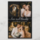 Budget, Modern, Elegant, Handwritten 3 Photo Collage Black and White Wedding Thank You Flyer/THIN Card. Minimalist wedding thank you card template featuring three (3) photo on the front and (1) one photo on the back side. With the text "Love and thanks" script in a cursive hand lettered calligraphy swash-tail font in white colour on black colour background. Little heart between the names. Personalise your custom name and thank you message. If you prefer to handwrite your note, just delete the sample text to make more space. If You need help or matching item, please contact designer!