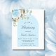 A white background decorated with eucalyptus greenery, a light blue rose, and golden leaves and a blue arch frame. Personalise and the childs name and ceremony details. Elegant hand lettered style script.