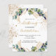 A white background decorated with eucalyptus greenery and golden leaves and faux gold glitter drops. Personalise and the childs name and ceremony details. Black and golden coloured letters.