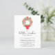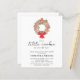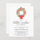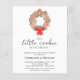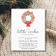 This simple modern invitation is decorated with a watercolor festive wreath of gingerbread cookies, holly, pine foliage, and a red bow.