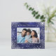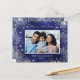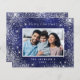 A deep blue background decorated with faux silver glitter dust, sparkling stars. The blue colour is uneven. Personalise and add your own photo, name and a year. With the text: Merry Christmas.