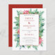 Christmas Poinsettia Frame Wedding Invitation. A budget price SMALLER 4.5” x 5.6” alternative. Available in a SEMI-GLOSS 110 lb CARD STOCK which is the default option (thicker for invitations), OR a SATIN FINISH 80 lb THINNER PAPER STOCK (ideal for enclosures). Envelopes are an optional extra and are slightly larger than the card size. . This festive design with holiday weddings in mind has a border of ush winter foliage with poinsettias and berries, and a single red line, around the words which you can easily personalise. A coordinating winter red background is on the back which you can change to another colour if you wish via the Customise Further option.