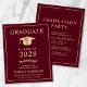 Elegant and budget-friendly burgundy red college graduation announcement and party invitation with a gold graduation cap and simple modern light gold typography for the graduate's name, class year, college or university, degree and major or honours.