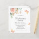A white background decorated with eucalyptus greenery, a rose gold and blush pink rose, golden leaves and butterflies. Personalise and a name and ceremony details.
