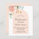 A white background decorated with eucalyptus greenery, a rose gold and blush pink rose, and golden leaves and a rose gold arch frame. Personalise and a name and ceremony details. Hand lettered style script.