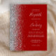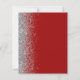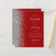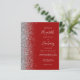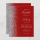 The left-hand edge of this elegant modern wedding invitation features a silver faux glitter border. The customisable text combines pale silver grey handwriting, copperplate and italic fonts on a crimson red background. The reverse side features a matching red and silver design.