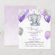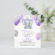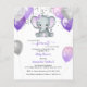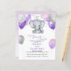 This adorable budget baby shower invitation features purple and grey baby girl elephant with balloons and confetti. Back features soft purple watercolor background. Easily customised for your event by clicking personalise.