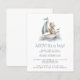 This cute baby shower invitation features a dusty blue and beige watercolor illustration of a teddy bear riding in a sailboat. The words "AHOY! It's a Boy!" and the name of the mom-to-be appear in dusty blue decorative font. Ideal for a nautical-themed boy's baby shower.