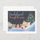 BUDGET Dachshund through the snow .. fun holiday themed Christmas dog card from Ricaso - featuring a cute dachshund wearing a Christmas jumper and bobble hat beside a Christmas tree, and on a background of a dark blue sky with snow falling