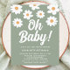 This budget baby shower invitation is decorated with hand-drawn daisies and Oh Baby! in white retro typography on a sage green background.