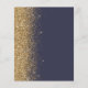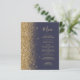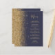 The left-hand edge of this elegant modern wedding menu features a gold faux glitter border. The customisable text combines gold-coloured whimsical handwriting script and copperplate fonts on a dark blue background. The reverse side features a matching dark blue and gold glitter design.
