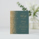 The left-hand edge of this elegant modern wedding invitation features a gold faux glitter border. The customisable text combines gold coloured handwriting, copperplate and italic fonts on a dark green background. The reverse side features a matching dark green and gold glitter design.