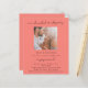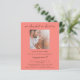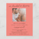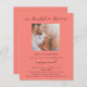 Budget We Decided On Forever Photo Engagement Party Coral Rose Invitation. A budget price SMALLER 4.5” x 5.6” alternative. Available in a SEMI-GLOSS 110 lb CARD STOCK which is the default option (thicker for invitations), OR a SATIN FINISH 80 lb THINNER PAPER STOCK (ideal for enclosures). A modern design to announce your exciting news, with handwritten style set script for We Decided On Forever above your photo which is in square format and the rest of the text you can easily personalise. Choose a romantic photo of you both and replace the sample photo in the template placeholder with it. You can also change the coral background on the front and back, via the Customise Further option if you wish, as well as the text colour to better match your chosen photo.