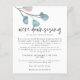 Wedding Downsizing Script Eucalyptus. A budget price SMALLER 4.5” x 5.6” alternative. Available in a SEMI-GLOSS 110 lb CARD STOCK which is the default option (thicker for invitations), OR a SATIN FINISH 80 lb THINNER PAPER STOCK (ideal for enclosures). Envelopes are an optional extra and are slightly larger than the card size. For times when a socially distanced smaller wedding ceremony is essential and you need to un-invite some guests and ask them to join the live streaming instead, this contemporary design has an artsy modern branch of watercolor eucalyptus leaves from the top left and informal handwriting stylish script for the heading, We’re Downsizing. The rest of the text you can easily personalise with your details. You can also change the coordinating teal blue background colour on the back to another colour if you wish via the Customise Further option.