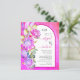 Budget Tropical protea flowers, pampas grass and eucalyprus leaves magenta pink arch wedding invitation with QR code. This lovely wedding design features an arch frame on magenta fuchsia pink stained background with your initals and text. On the left there are protea flowers, pampas grass and eucalyptus leaves. The back includes the QRcode to RSVP online.