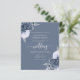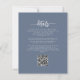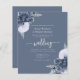 This elegant wedding invitation features dusty blue floral bouquets set off with silver faux foil greenery in two corners, on a dusty blue background. The customisable text combines silver grey serif, italic and handwriting fonts. The reverse side provides space for wedding details, along with a QR code guests can scan to visit your website and RSVP.