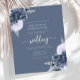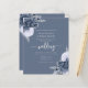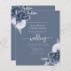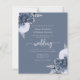 This elegant wedding invitation features dusty blue floral bouquets set off with silver faux foil greenery in two corners, on a dusty blue background. The customisable text combines silver grey serif, italic and handwriting fonts. The floral design is repeated on the reverse side.