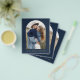Budget Wedding Navy Blue and Gold Save the Date Cards that have a photo on the front. The Save the Date cards contain a modern hand lettered cursive script typography that are elegant, simple and modern to use after you minimalist simple wedding day celebration.