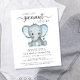 A cute and budget-friendly baby boy shower invitation featuring "A Sweet Little Peanut is on His Way" written in a mixture of soft grey modern typography and stylish script, and a pastel blue watercolor of a baby elephant. You can personalise the mother's name and shower details in simple grey typography. This budget semi-gloss paper is similar in weight to photo paper. A larger 5x7 traditional card stock version is also available (message us for the link).