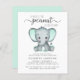 A cute and budget-friendly gender-neutral drive by baby shower invitation with "A Sweet Little Peanut Is On Its Way" (you can change to "His" or "Her" way) written in a mixture of soft grey typography and stylish script, and a pastel mint green watercolor of a baby elephant. Personalise the mother's name and shower details in simple grey typography.
