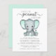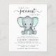 A cute and budget-friendly gender-neutral virtual baby shower invitation with "A Sweet Little Peanut Is On Its Way" (you can change to "His" or "Her" way) written in a mixture of soft grey typography and stylish script, and a pastel mint green watercolor of a baby elephant. Personalise the mother-to-be's name and shower details in simple grey typography.