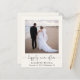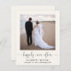 Simple light cream budget-friendly elopement or smaller wedding announcement and post-wedding reception or party invitation. The front features your photograph, "happily ever after" written in a trendy script with swashes and your first names and wedding date and location. On the back, you can personalise your wedding announcement in more detail, add a reception or party invitation and sign your married names in a signature-like script.