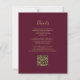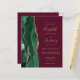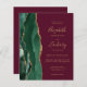 The left-hand edge of this elegant modern wedding invitation features an emerald green watercolor agate border trimmed with faux gold glitter. The customisable text combines gold-coloured handwriting, copperplate and italic fonts on a burgundy red background. The reverse side provides space for wedding details, along with a QR code guests can scan to visit your website and RSVP, which saves the cost of printing and mailing separate RSVP cards.