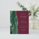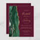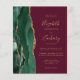 The left-hand edge of this elegant modern wedding invitation features an emerald green watercolor agate border trimmed with faux gold glitter. The customizable text combines gold-colored handwriting, copperplate and italic fonts on a burgundy red background. The reverse side provides spaces for 4 photos (1 square, 2 horizontal, 1 long vertical) and room for your wedding website URL or other information.