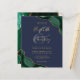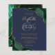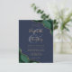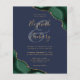 An emerald green watercolor agate design trimmed with faux gold glitter appears in two corners of this elegant design. Personalize it with the couple's names in gold-colored handwriting script over a large blue ampersand. Add the wedding details in gold-colored copperplate and italic fonts on a navy blue background. The reverse side features a matching green and gold agate design.