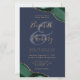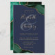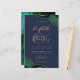 An emerald green watercolor agate design trimmed with faux gold glitter appears in two corners of this elegant design. Personalize it with the couple's names in gold-colored handwriting script over a large blue ampersand. Add the wedding details in gold-colored copperplate and italic fonts on a navy blue background. The reverse side features a matching green and gold agate design.
