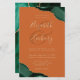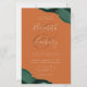 An emerald green watercolor agate design trimmed with faux gold glitter appears in two corners of this elegant design. Personalize it with the couple's names in gold-colored handwriting script over a large rust ampersand. Add the wedding details in gold-colored copperplate and italic fonts on a burnt orange background. The reverse side features a matching green and gold agate design.