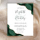 An emerald green watercolor agate design trimmed with faux gold glitter appears in two corners of this elegant design. Personalise it with the couple's names in charcoal grey handwriting script over a large, pale green ampersand. Add the wedding details in copperplate and italic fonts on a white background. The reverse side features a matching green and gold agate design.