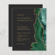 The right edge of this elegant modern wedding invitation features an emerald green watercolor agate border trimmed with faux gold glitter. The customisable text combines gold-coloured serif, copperplate and italic fonts on a slate black background. The reverse side provides space for wedding details on a solid slate black background, along with a QR code guests can scan to visit your website and RSVP, which saves the cost of printing and mailing separate RSVP cards.