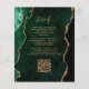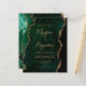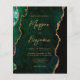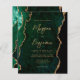 This elegant wedding invitation features a background image of emerald green watercolor agate trimmed with faux gold glitter. The customisable text combines gold-coloured modern handwriting, copperplate and italic fonts. The reverse side provides space for wedding details on a matching green agate background, along with a QR code guests can scan to visit your website and RSVP, which saves the cost of printing and mailing separate RSVP cards.