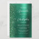 The left-hand edge of this elegant modern wedding invitation features an emerald green faux glitter border. The customisable text combines white handwriting and sans serif fonts on a green faux brushed metal background. The reverse side provides space for wedding details on an emerald green brushed metal background, along with a QR code guests can scan to visit your website and RSVP, which saves the cost of printing and mailing separate RSVP cards.