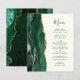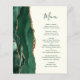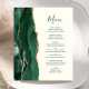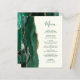 The left-hand edge of this elegant modern wedding menu features an emerald green watercolor agate border trimmed with faux gold glitter. The customisable text combines whimsical green handwriting script and copperplate fonts on an ivory background. The reverse side features a matching emerald green and gold agate design.