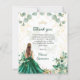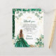 The quinceañera invitation features a luxurious, nature-inspired design with a green and gold colour palette. The front shows a watercolor illustration of a young woman in an emerald ballgown framed by eucalyptus leaves, flowers, and gold accents, creating an elegant and dreamy look. The back continues the theme with a glamourous photo of a young woman in a sparkling gown against a rich green backdrop, surrounded by the same floral and botanical elements for a cohesive, sophisticated feel.