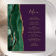 The left-hand edge of this elegant modern wedding menu features an emerald green watercolor agate border trimmed with faux gold glitter. The customisable text combines gold-coloured whimsical handwriting script and copperplate fonts on a purple background. The reverse side features a matching emerald green and gold agate design.