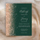 The left-hand edge of this elegant modern wedding invitation features a peach faux glitter border. The customisable text combines pale peach handwriting, copperplate and italic fonts on an emerald green background. The reverse side features a matching peach glitter and emerald green design.