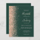 The left-hand edge of this elegant modern wedding invitation features a peach faux glitter border. The customisable text combines peach handwriting, copperplate and italic fonts on an emerald green background. The reverse side provides space for wedding details on a solid green background, along with a QR code guests can scan to visit your website and RSVP, which saves the cost of printing and mailing separate RSVP cards.
