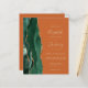 The left-hand edge of this elegant modern wedding invitation features an emerald green watercolor agate border trimmed with faux gold glitter. The customizable text combines gold-colored handwriting, copperplate and italic fonts on a burnt orange background. The reverse side provides spaces for 4 photos (1 square, 2 horizontal, 1 long vertical) and room for your wedding website URL or other information.