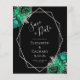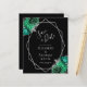 This elegant modern wedding save the date card features a silver geometric frame decorated with emerald green and silver floral bouquets on a black background. The customisable text combines silver grey whimsical handwriting, copperplate and italic fonts. The reverse side is solid black.