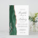 The left-hand edge of this elegant modern wedding invitation features an emerald green watercolor agate border trimmed with faux rose gold glitter. The customizable text combines charcoal gray handwriting, copperplate and italic fonts on a white background. Add additional details on the back, along with a QR code to help your guests visit your wedding website.