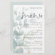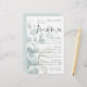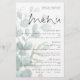 Budget Eucalyptus Elegant Script Wedding Menu. A budget price size 5.5” x 8.5”, on an elegant 110 lb LINEN stock – for a luxury feel at great value, this is perfect for menus, as well as invitations and programs etc. This budget size alternative is also available in other paper choices. The SEMI-GLOSS 110 lb card stock is about the same thickness as a postcard, so also works well for invitations. The FELT 100 lbs paper is buff coloured, NOT white, so adds a rustic touch. The MATTE 80lbs paper stock is bright white, for crisp printing, great for your menus and programs, whilst the SATIN 80lbs paper is thin and light, ideal for enclosures. PLEASE NOTE THE OPTIONAL ENVELOPES ARE A LITTLE BIGGER IN SIZE AT 6.75” x 9” approx. This modern design has Menu in elegant set script at the top and the rest of the text aligned to the right below which you can easily personalise, with a tinted background of blue eucalyptus.