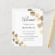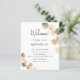 A modern, elegant, wedding program, timeline. White background, decorated with golden eucalyptus, sprigs. Personalise and add your names and wedding details. Black coloured letters. If you have more text it's possible to reduce the line space and also add text on the back.