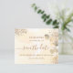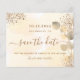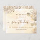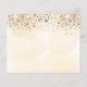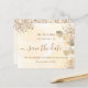 A golden watercolored background decorated with golden eucalyptus foliage and faux gold glitter dust. Personalize and add the date, place and your names. Golden colored letters. The text: Save the Date is written with a large trendy hand lettered style script.