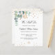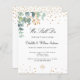 A chic white background. Decorated with green watercolored eucalyptus leaves, sprigs, greenery and a faux gold sprig. Golden hearts sprinkle. Personalise and add your names and ceremony details. Black letters.